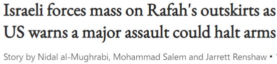 Not content with angering the “Putin stooges” who oppose funding the Ukraine war, President Biden decided to anger the Pro-Israeli side of the Israel/Palestine war by threatening to withhold weapons if Israel assaults Rafah — essentially telling them: “Don’t”. (It’s worked so well in the past!)