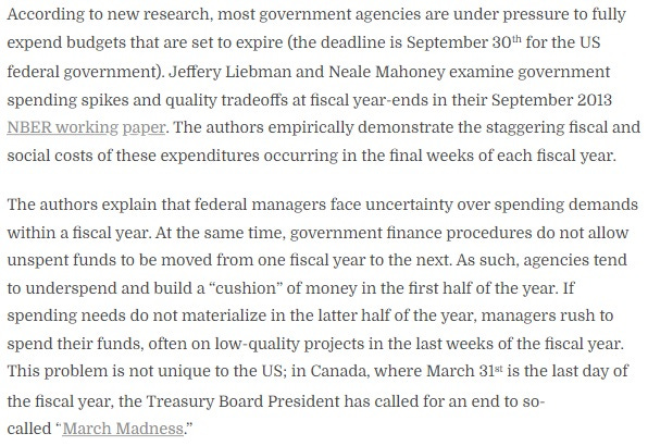 With government playing the part of the kid frantically spending his allowance so he gets more later, it’s so surprise that we’re paying more and more for government ‘services’. The incentives in this case are clear — if you don’t spend all this money, you won’t get as much money next year. Not only are these government workers acting rationally, this is the predictable consequence of adopting the “use it or lose it” incentives. It was ALWAYS destined to end up this way. (Thus, we were also destined to get articles telling us how to take advantage of it!)