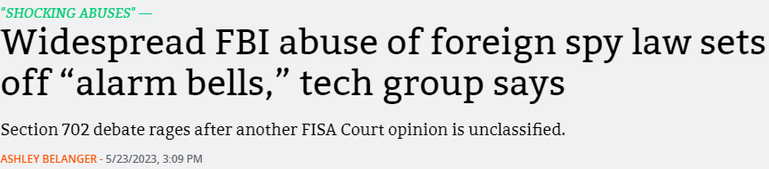 For years, the Foreign Intelligence Surveillance Act has been criticized as a ‘loophole’ to the Fourth Amendment’s restriction on government spying on Americans — even though FISA is supposed to be restricted to FOREIGN entities. In just 2020 and 2021, the FBI illegally used FISA to conduct nearly 280,000 warrantless inquiries into Americans — many of these for the ‘crime’ of protesting (both on 1/6 and for George Floyd).